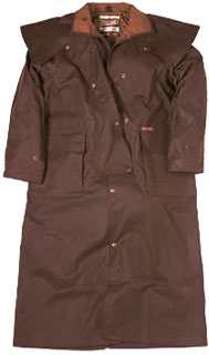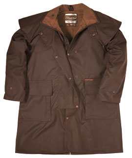 Tkanina : bawełna 100% olejowana, wodoodporna. Tradycyjny krój z „ogonem” na siodło, poły zapinane na nogach, wzmocnienia na łokciach. Tkanina bezwonna i miękka zapewniająca jednak doskonałą ochronę przed deszczem. Klasyczny płaszcz kowbojski, znany jako Driza-Bone. Możliwość dopięcia podpinki polarowej. Kolory : Brąz, czarny, granat Rozmiary : XXS – 4XL |